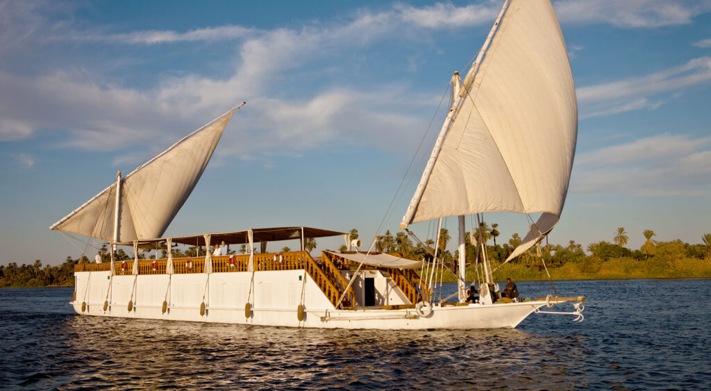 Cruise the Nile in style on the Golden Lady of the Nile, Nebyt Dahabiya. The Nebyt, one of Ashranda’s most luxuorious Dahabiyas, will offer you elegantly decorated cabins, a shaded sun deck level with a hot tub and chaise lounges. Nebyt Dahabiya will take you between the historic cities of Luxor and Aswan. You will see unique sites, not available on any cruise, such as sailing to El Batekh Island, visiting El Kab Temple and and El Kab village and much more. You will discover the Nile in a very special and unique way while enjoying indescribable calmness and serenity.